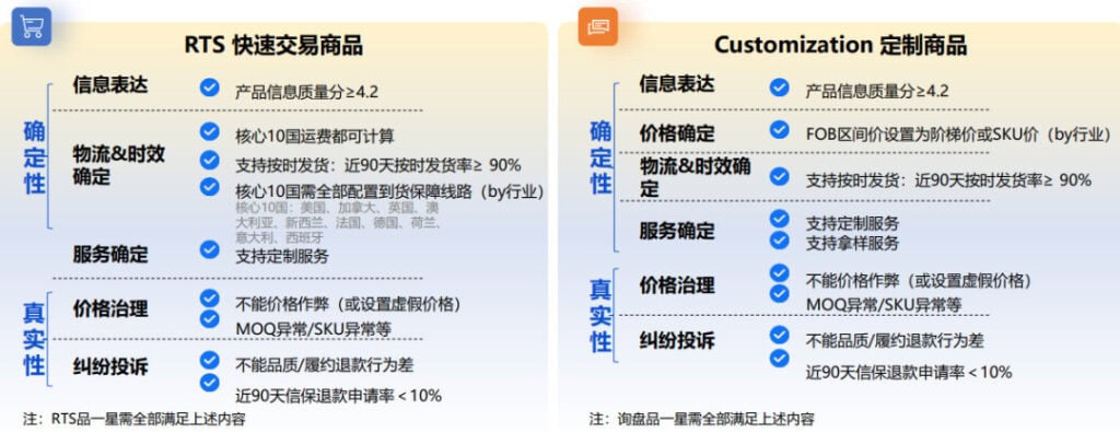 首先是一星商品,其產(chǎn)品評定主要聚焦買家采購的確定性要素和商品的真實性信息表達,同時根據(jù)發(fā)布的賽道不同,RTS品和定制品的信息要求會有不同。