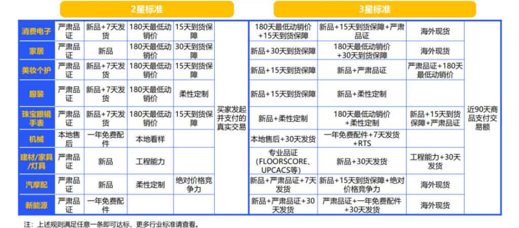 其次是二星和三星的標準,根據(jù)行業(yè)不同全面開花,比較有特色的地方在于,二星標準中嚴肅品證基本涵蓋所有行業(yè),同時,對應發(fā)貨保障和定制的新品,在商品星等級的評定中會大占優(yōu)勢。