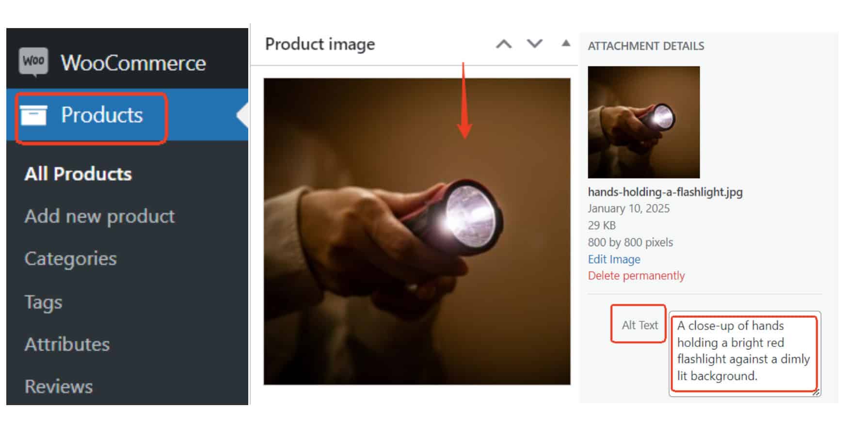 我們可以在ALT文本中自然地融入有搜索量的產(chǎn)品關(guān)鍵詞,使其更容易被抓取到,但要避免關(guān)鍵詞堆砌。以WordPress為例,上傳產(chǎn)品圖片時(shí),點(diǎn)擊Product image,即可進(jìn)入相應(yīng)頁面,為圖片添加ALT描述:
