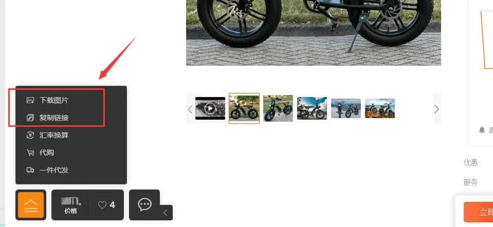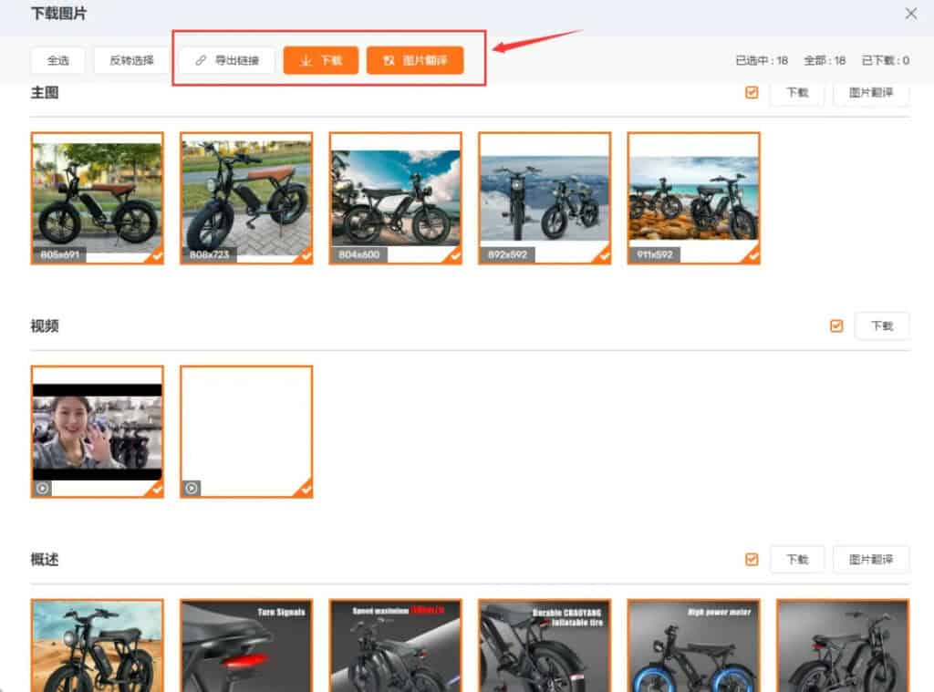 打開產(chǎn)品詳情頁,點擊右下角菜單欄下載圖片按鈕,可以下載產(chǎn)品視頻、主圖、SKU圖片以及產(chǎn)品描述圖片,還可以導(dǎo)出產(chǎn)品鏈接。如果有需要將產(chǎn)品圖的中文轉(zhuǎn)換成其他語言,可以選中需要翻譯的圖片,點擊圖片翻譯進行翻譯和編輯。如果你是做雜貨的,需要海量發(fā)品測品或沒時間拍照片的可以采取這種方式,不過要小心侵權(quán)哦。