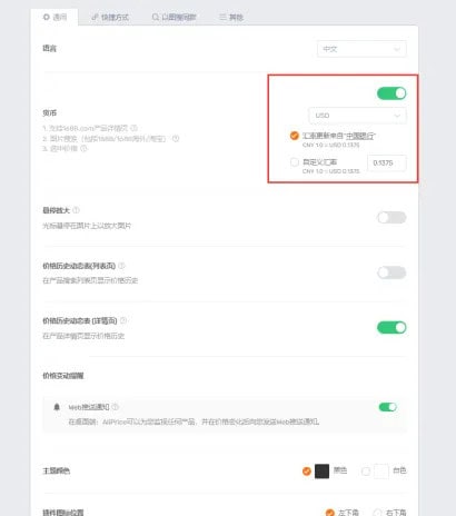 需要在插件設(shè)置中,開啟此功能,還可修改貨幣自定義匯率。開啟之后,支持在圖搜結(jié)果頁、以及產(chǎn)品詳情頁顯示匯率換算,打開右下角菜單欄點擊匯率換算,填寫對應(yīng)金額,即可顯示換算結(jié)果。