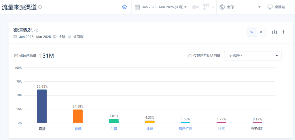 以2025年1~3月份為例,整個(gè)國(guó)際站的流量來源大致為:站內(nèi)流量(直接流量)占總流量的60.55%;站外流量占總流量的39.45%(包括來自搜索引擎的自然流量、廣告投放、外鏈、展示廣告、社交、電子郵件等)。