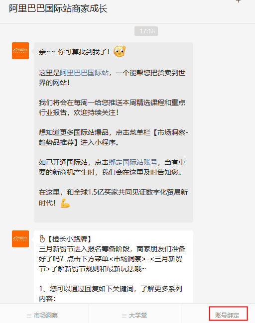 1、微信掃描后臺二維碼或關(guān)注“阿里巴巴國際站商家成長”公眾號
