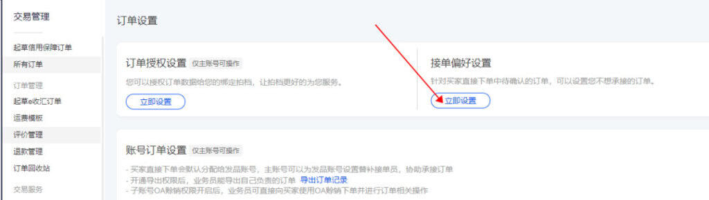 1、交易管理 – 所有訂單 – 訂單設(shè)置 – 接單偏好設(shè)置 – 立即設(shè)置